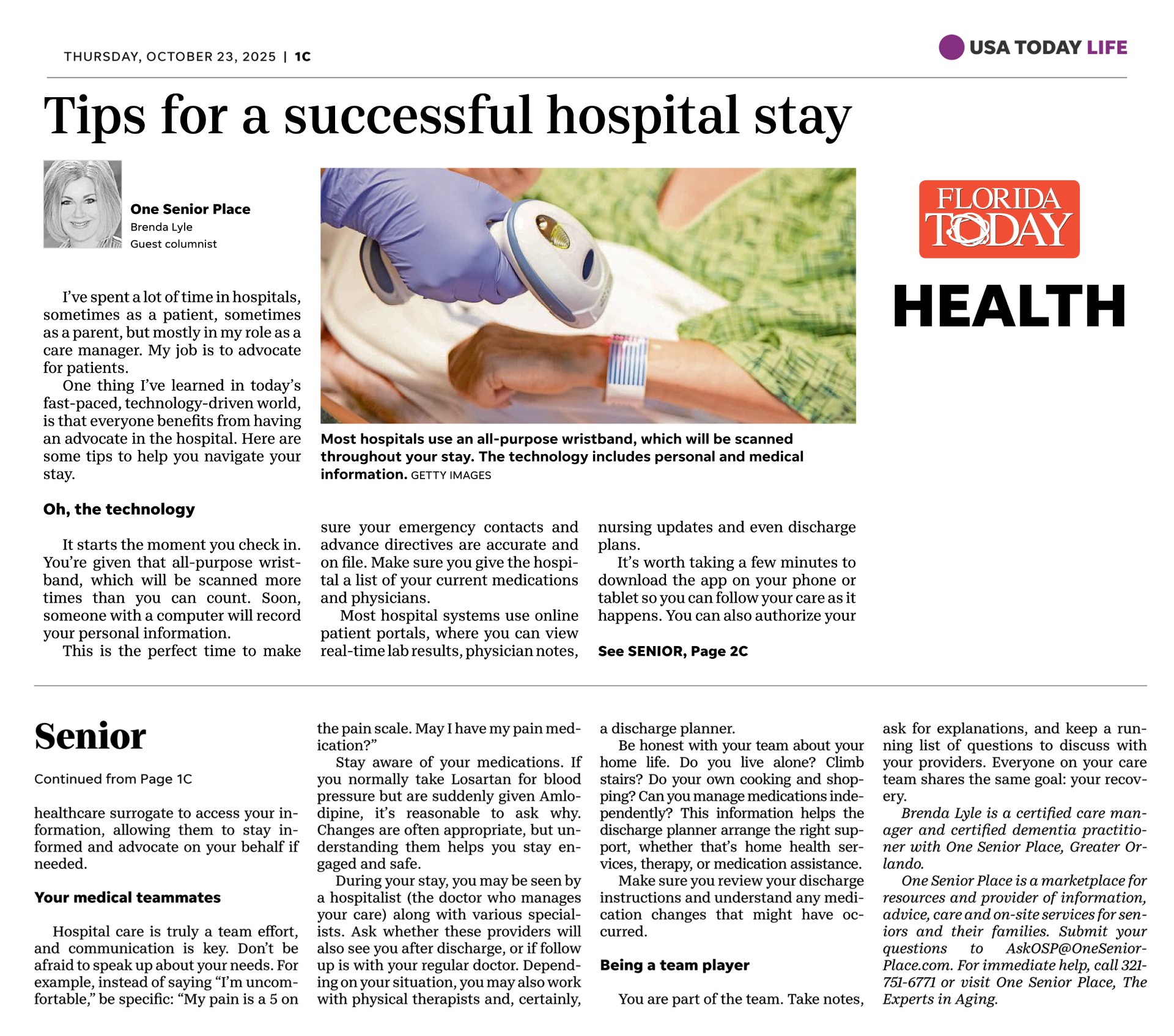 Brenda Lyle is a Certified Care Manager and Certified Dementia Practitioner with One Senior Place, Greater Orlando. One Senior Place is a marketplace for resources and provider of information, advice, care and on-site services for seniors and their families. Submit your questions to AskOSP@OneSeniorPlace.com. For immediate help, call 321-751-6771 or visit One Senior Place, The Experts in Aging.