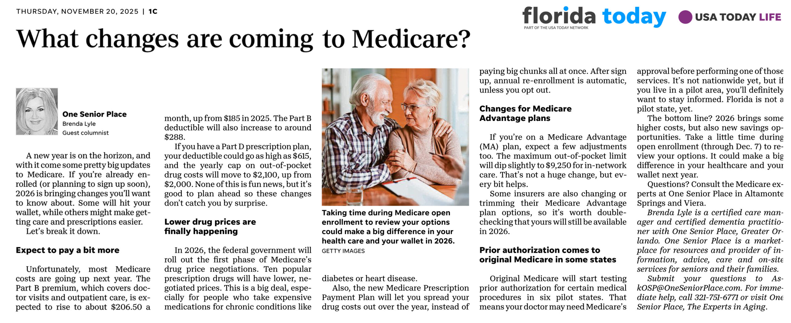 The bottom line? 2026 brings some higher costs, but also new savings opportunities! Take a little time during Open Enrollment (through December 7) to review your options. It could make a big difference in your healthcare and your wallet next year. Questions? Consult the Medicare experts at One Senior Place in Altamonte Springs and Viera.