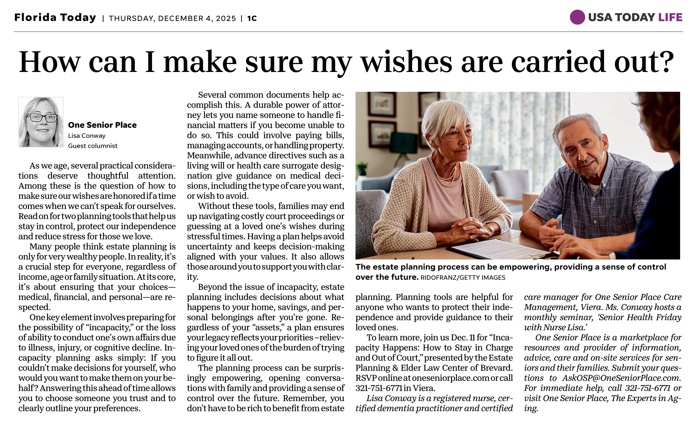 To learn more, join us December 11th for Incapacity Happens: How to Stay in Charge and Out of Court, presented by the Estate Planning & Elder Law Center of Brevard. RSVP online at OneSeniorPlace.com/events or call 321-751-6771 in Viera.