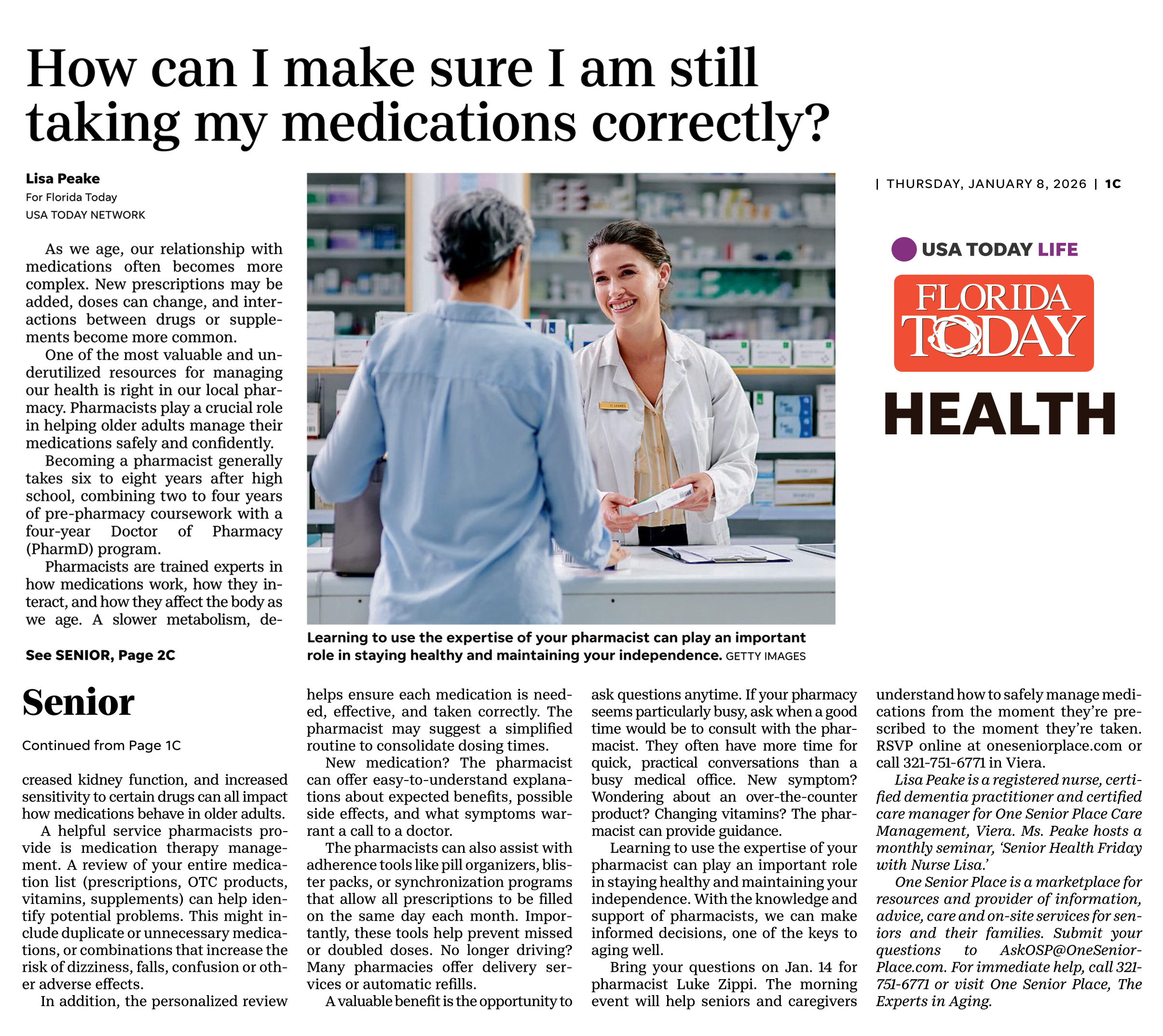 Lisa Peake is a Registered Nurse, Certified Dementia Practitioner and Certified Care Manager for One Senior Place Care Management, Viera. Ms. Peake hosts a monthly seminar, ‘Senior Health Friday with Nurse Lisa.’ One Senior Place is a marketplace for resources and provider of information, advice, care and on-site services for seniors and their families. Submit your questions to AskOSP@OneSeniorPlace.com. For immediate help, call 321-751-6771 or visit One Senior Place, The Experts in Aging.