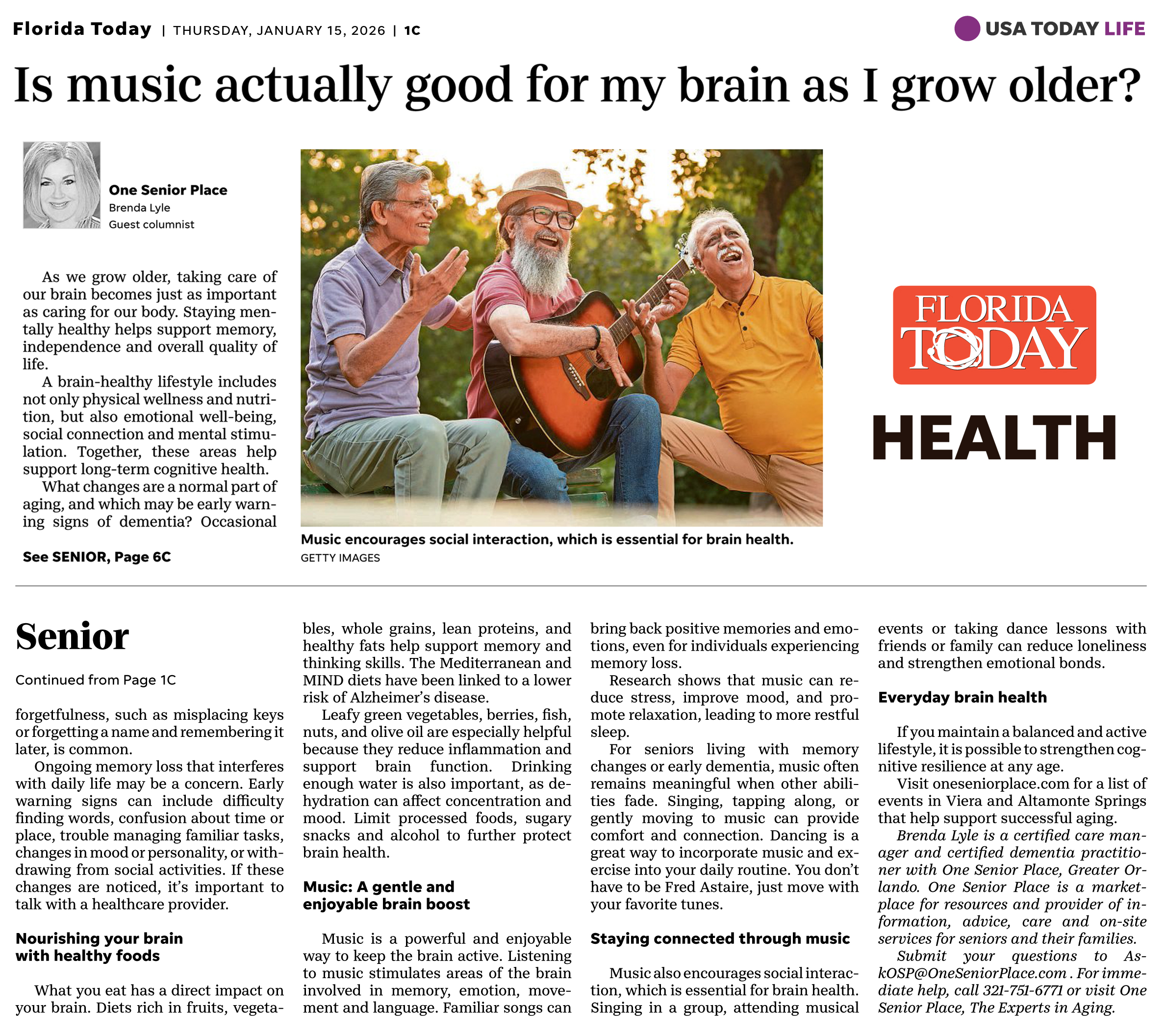 Brenda Lyle is a Certified Care Manager and Certified Dementia Practitioner with One Senior Place, Greater Orlando. One Senior Place is a marketplace for resources and provider of information, advice, care and on-site services for seniors and their families. Submit your questions to AskOSP@OneSeniorPlace.com. For immediate help, call 321-751-6771 or visit One Senior Place, The Experts in Aging.