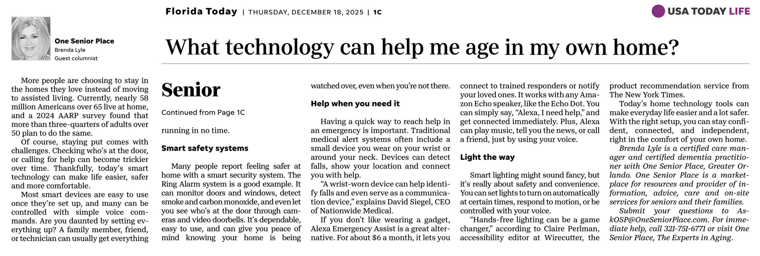 Brenda Lyle is a Certified Care Manager and Certified Dementia Practitioner with One Senior Place, Greater Orlando. One Senior Place is a marketplace for resources and provider of information, advice, care and on-site services for seniors and their families. Submit your questions to AskOSP@OneSeniorPlace.com. For immediate help, call 321-751-6771 or visit One Senior Place, The Experts in Aging.